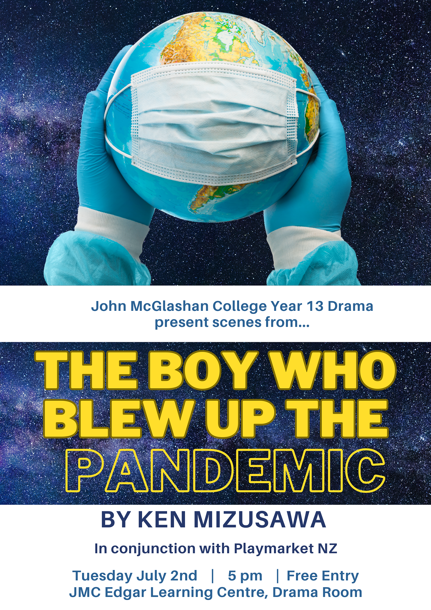 We're pleased to announce this year's major Drama Production in conjunction with Playmarket NZ - 'The Boy Who Blew Up the Pandemic' by Ken Mizusawa!