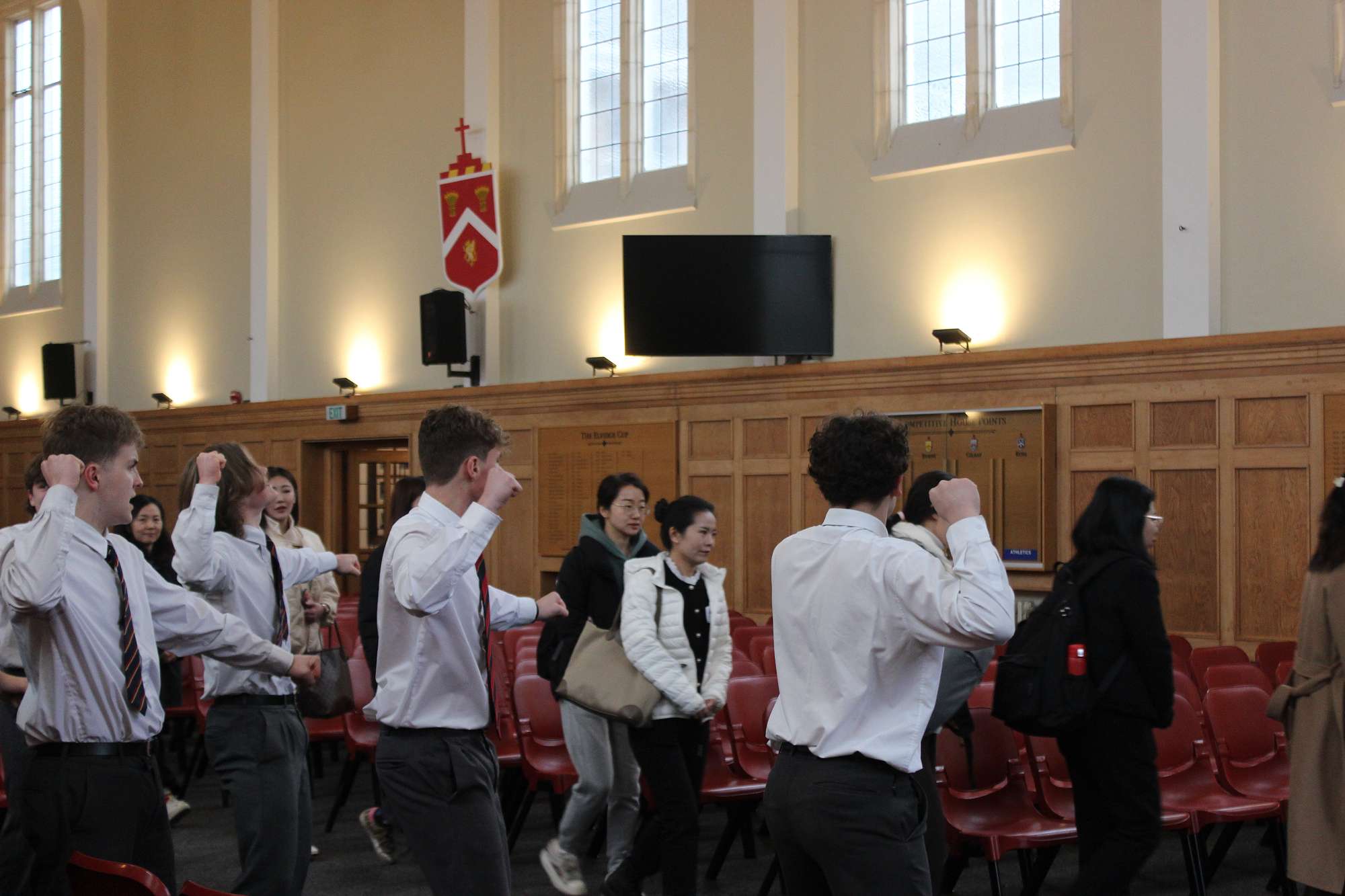 On their way into the chapel, the Kapa Haka rōpū channeled a fierce haka for the manuhiri, bringing Te Ao Māori into the fold and setting the scene for the two groups to face and greet one-another formally. The visitors responded with a beautiful waiata in mandarin (pictured above) and we finished up with the traditional hongi.