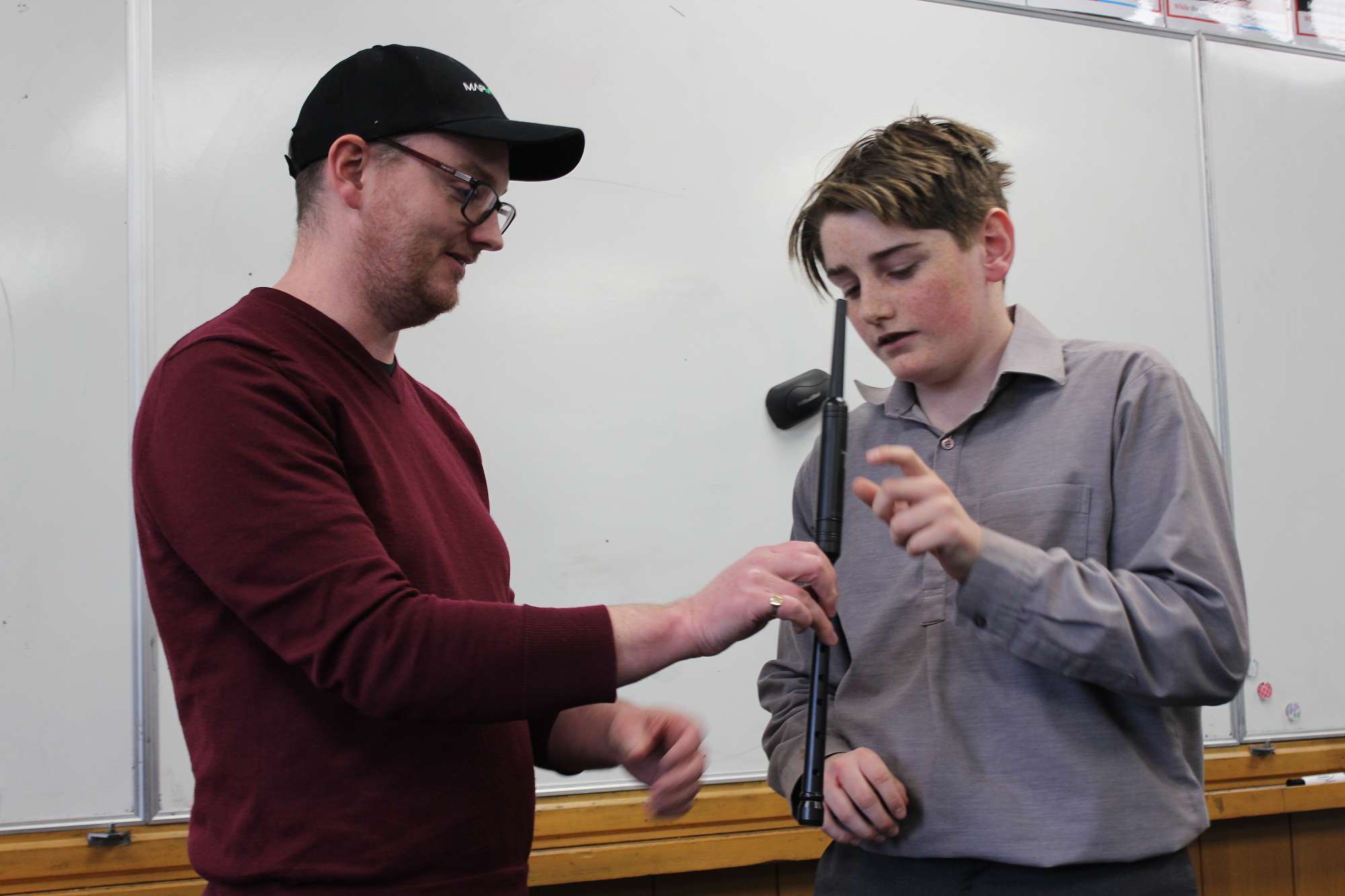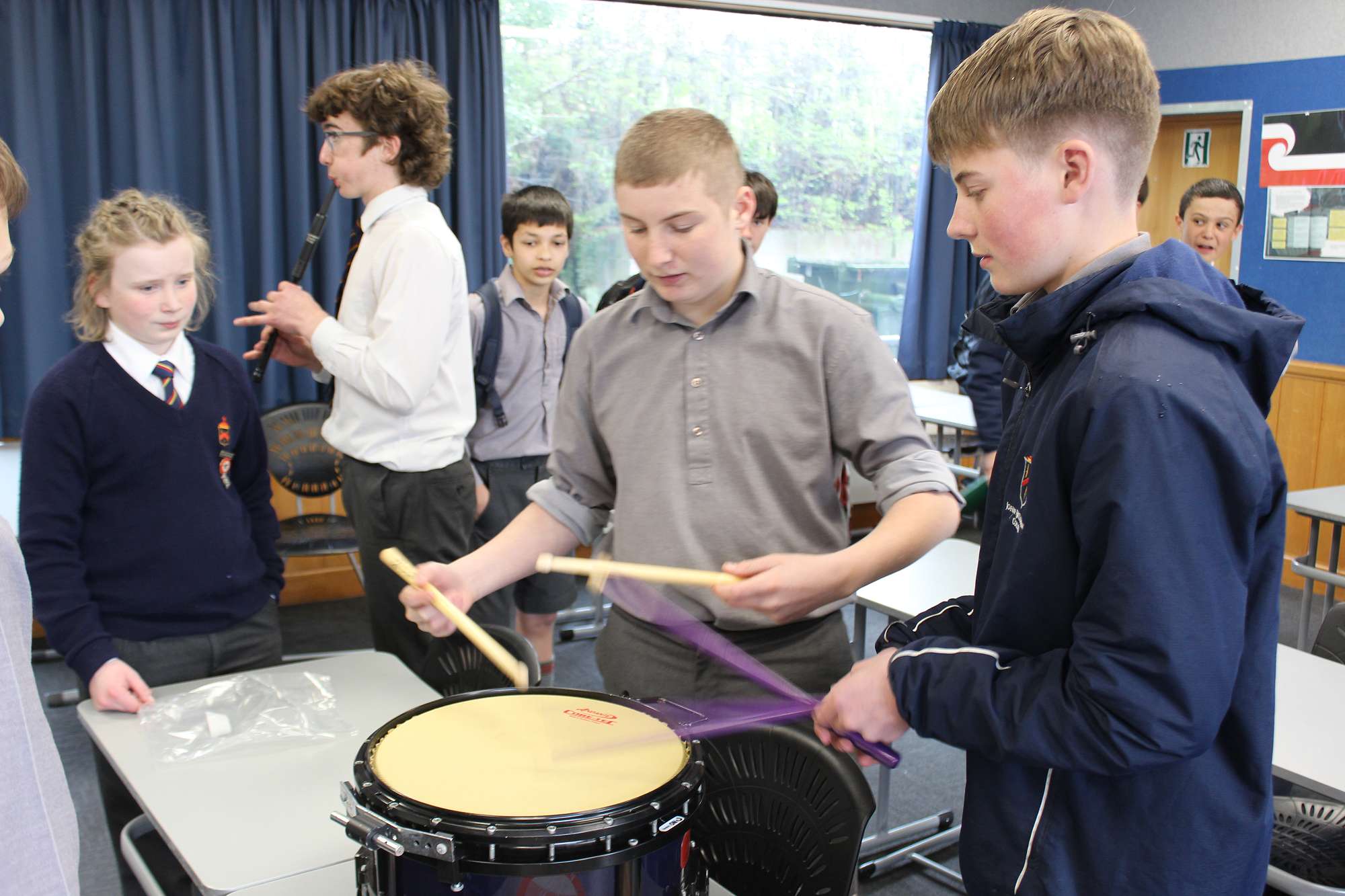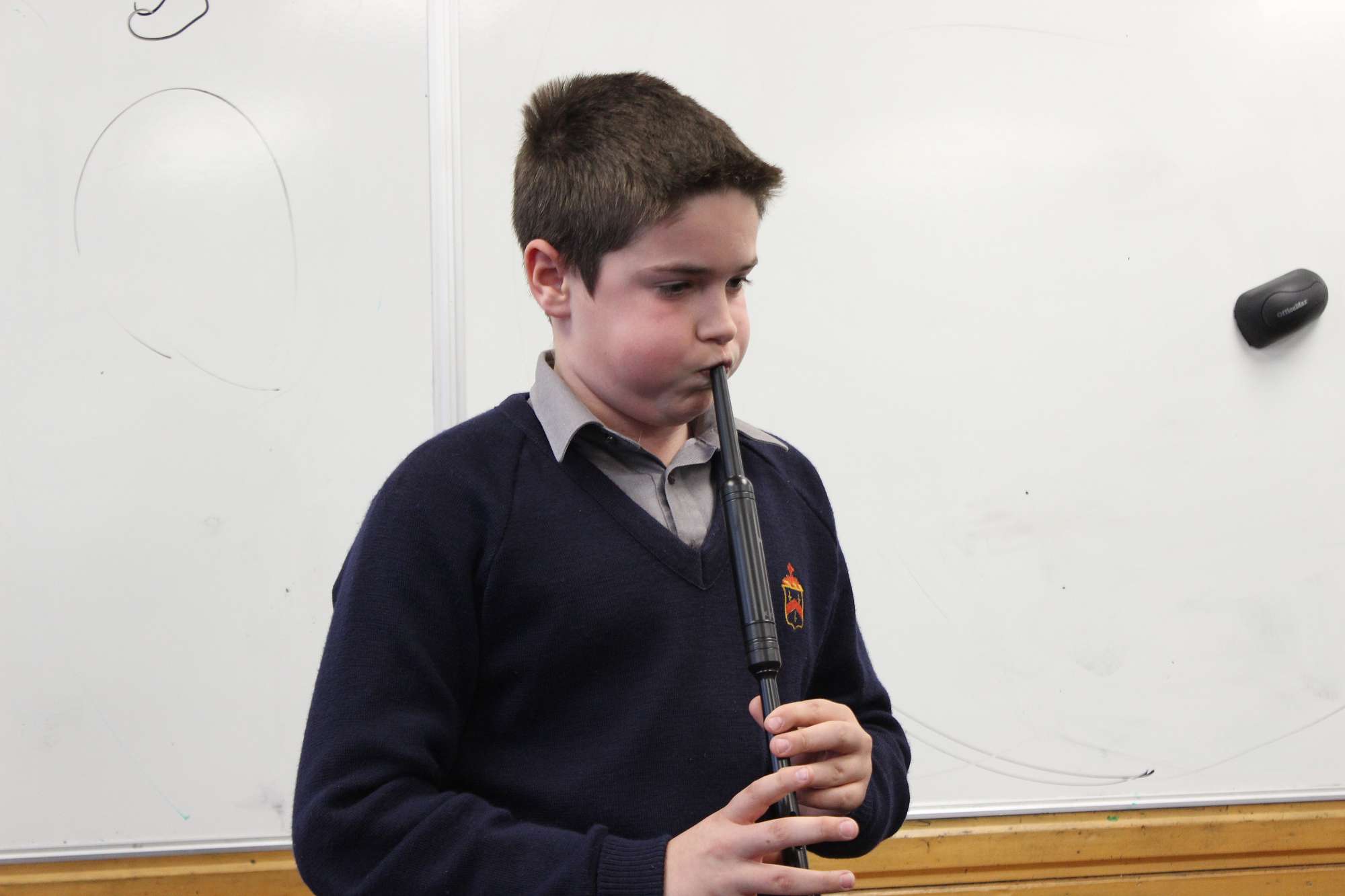 Sam gave a great demonstration, with Mr Hunter bringing along his box of chanters and drums so the boys could get hands on with the equipment.
