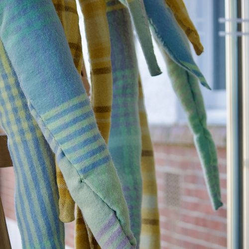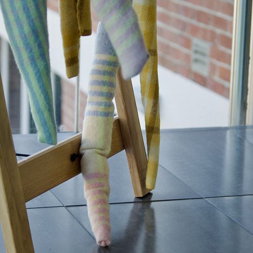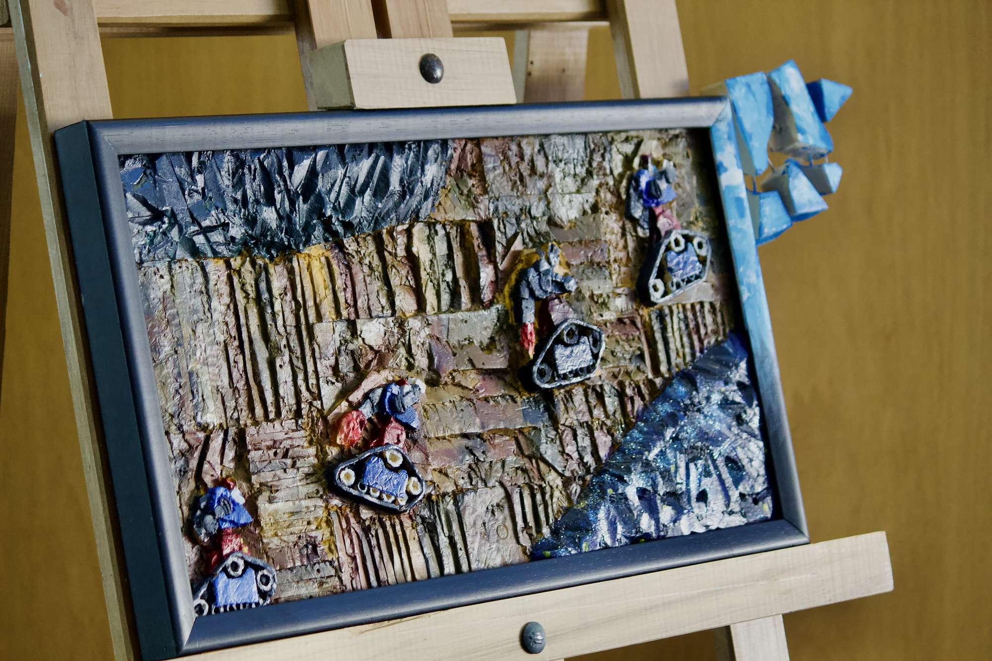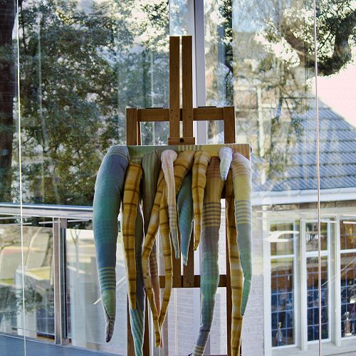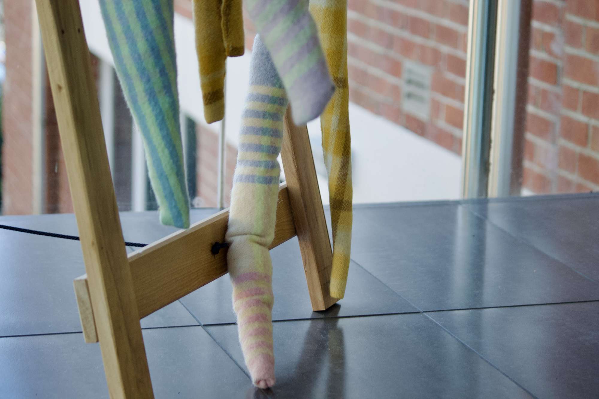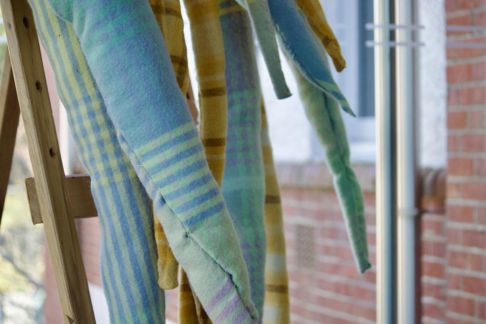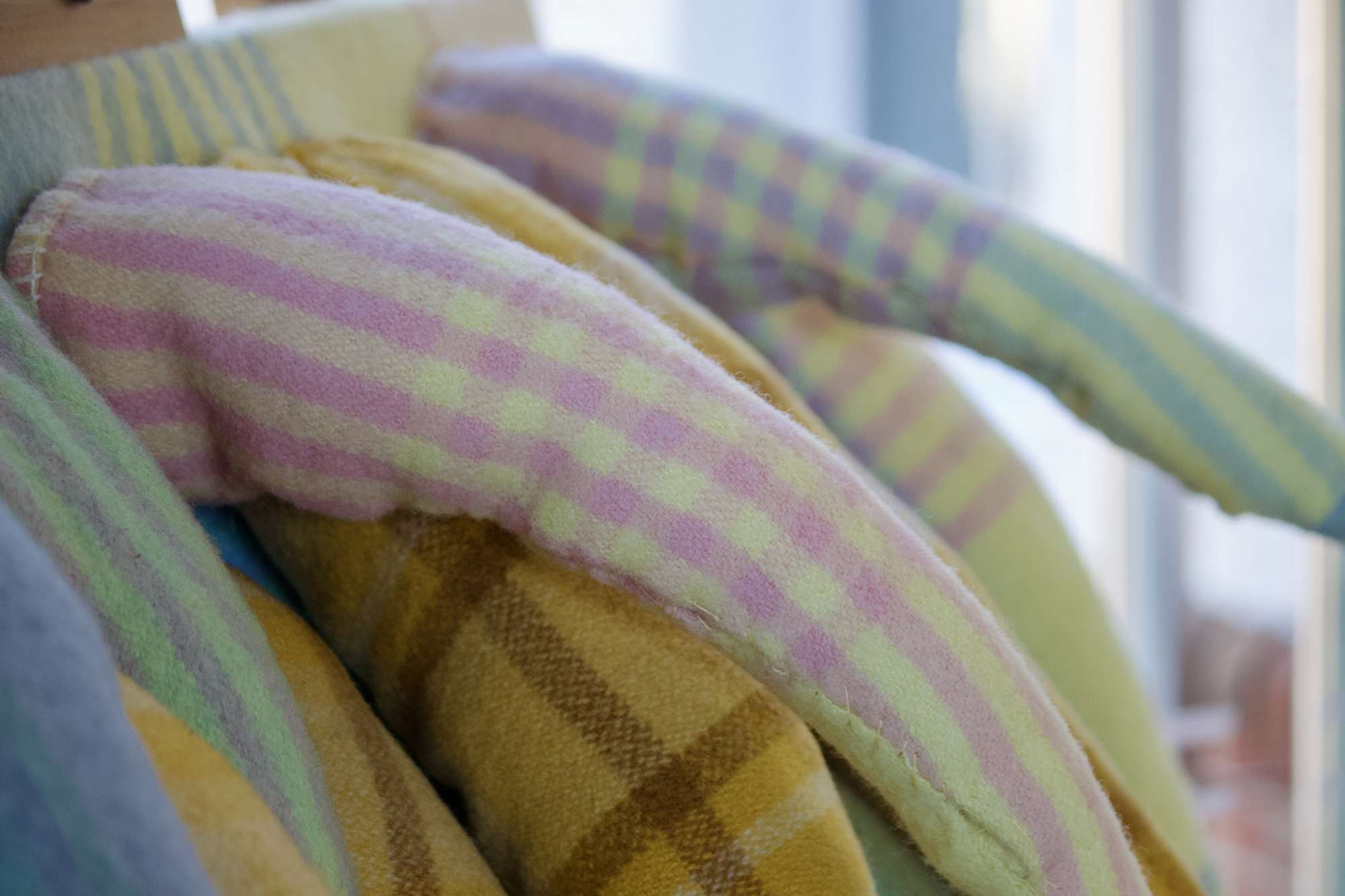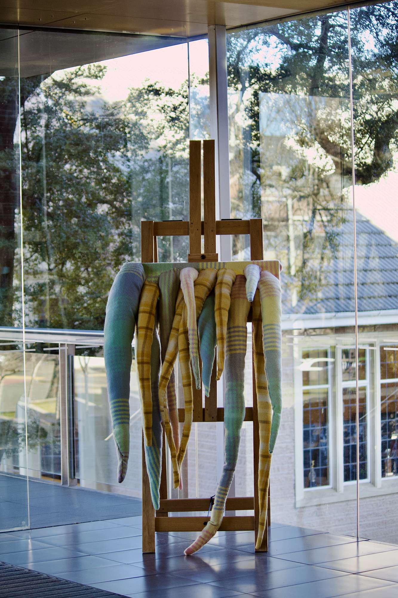 This sculpture was sewn together with woollen blankets, a key aspect that holds great significance in his story, and is stapled to a wooden frame.
