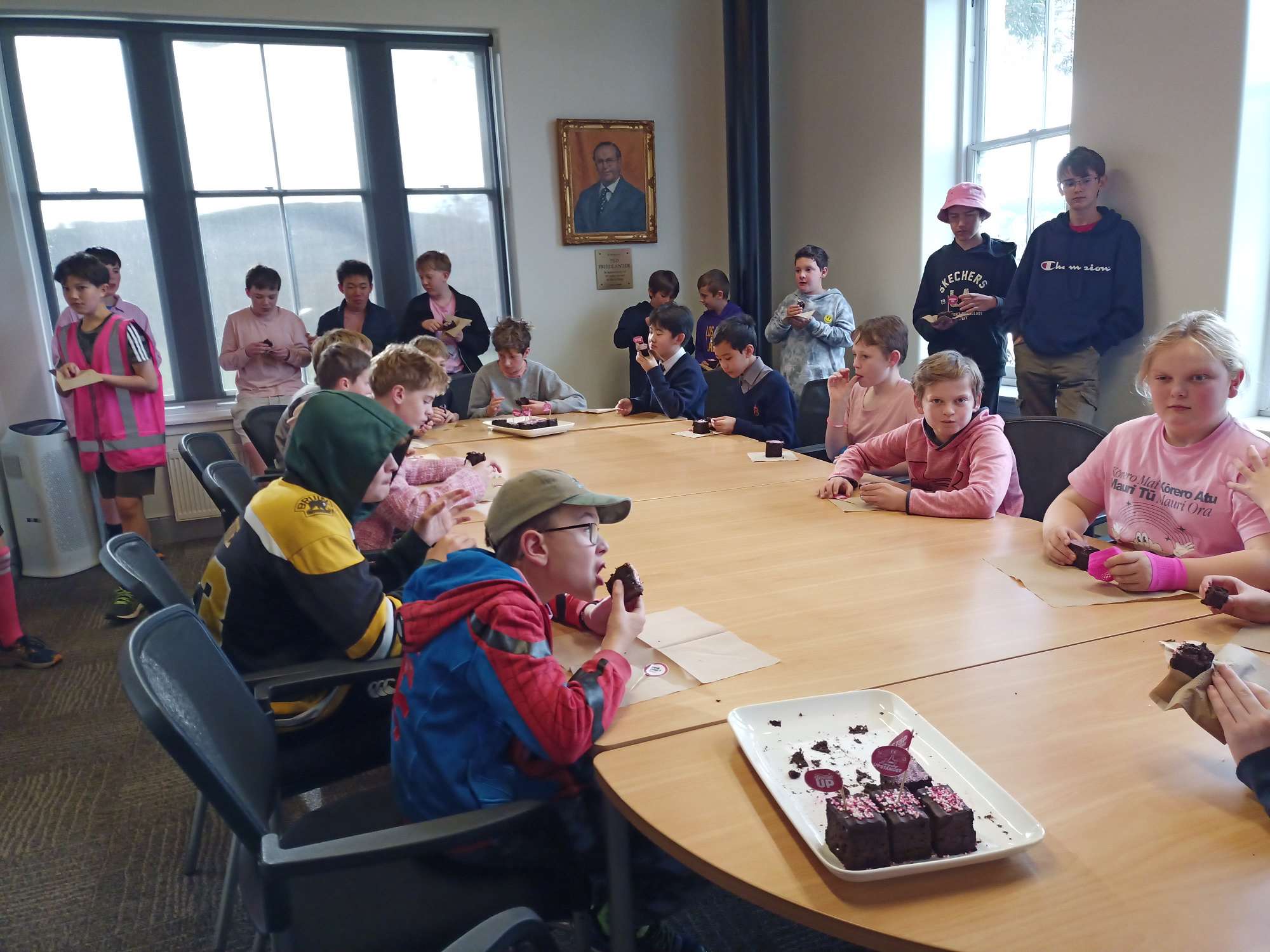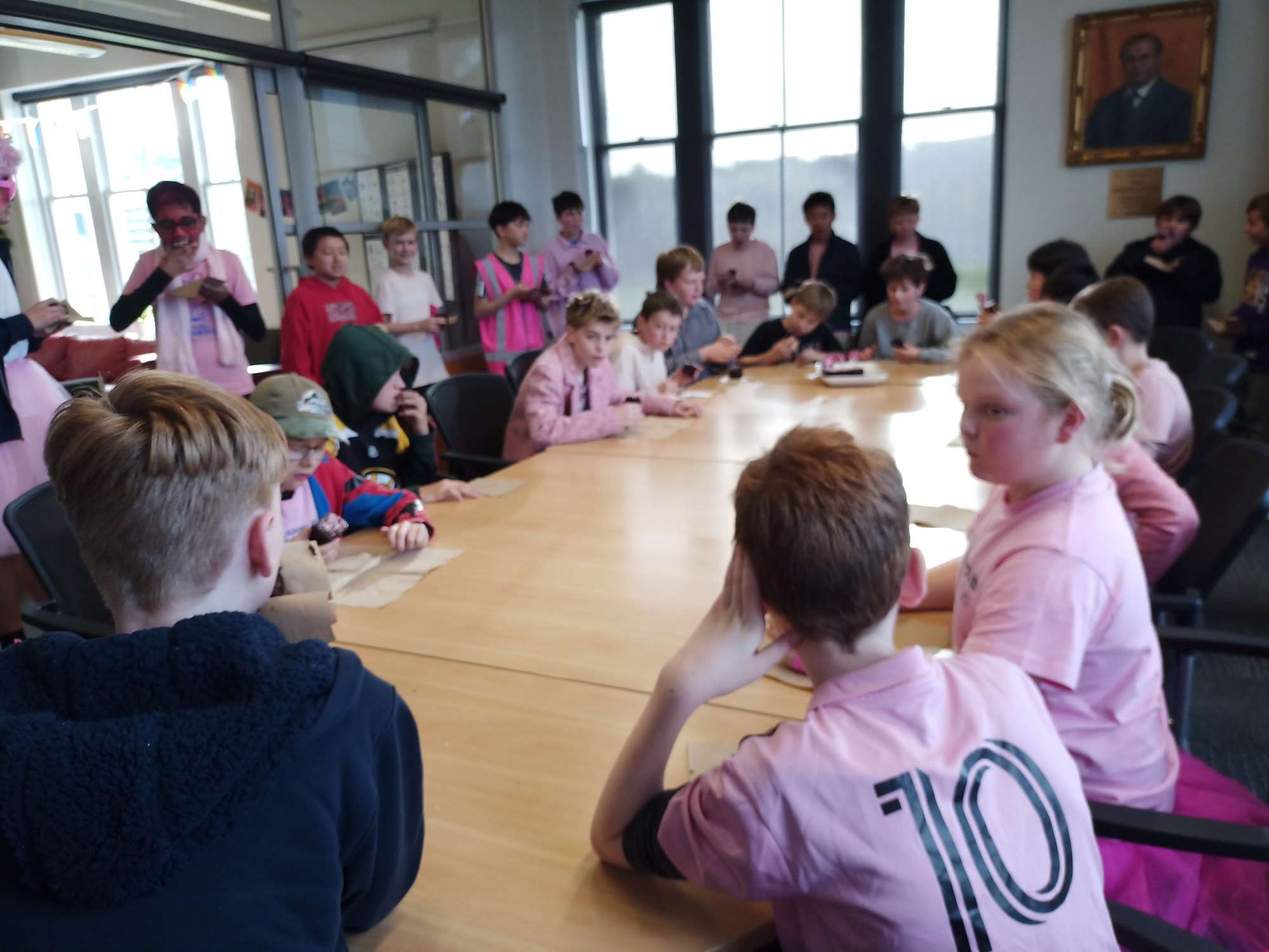 Thursday 15th May 2025 Our student librarians came together at interval today to celebrate Pink Shirt Day. The boys enjoyed a pink-themed cake, rocked their pink outfits, and listened to a fun story about friends working together. Ka rawe!