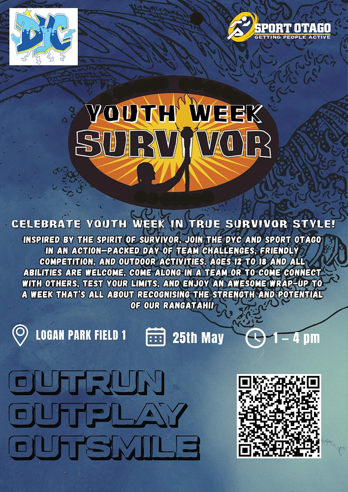 This Sunday 25th May, Dunedin Youth Council in conjunction with Sport Otago are running a Survivor style event for 12-18 year olds from 1-4pm at Logan Park. All abilities are welcome.
