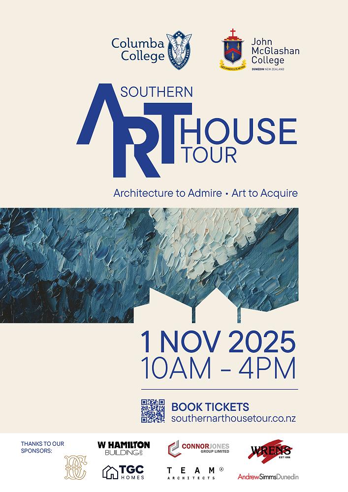 Please support our local businesses that have sponsored each of our homes – Andrew Simms Dunedin, W Hamilton Building, Connor Jones Group Limited, Wrens, TGC Homes, Team Architects and The Dunedin Club. This sponsorship level is closed for 2025 but please let us know if you would be interested in this for 2026’s Southern Art House Tour. Email southernarthouses@gmail.com