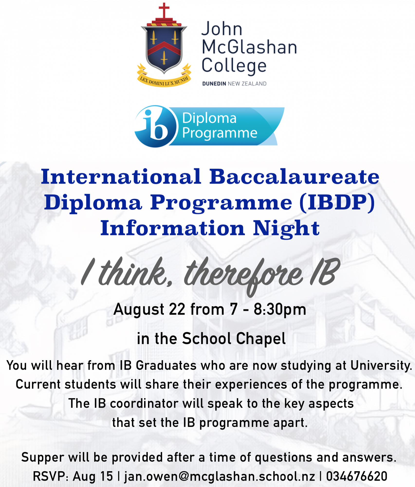If you want to know more about the IBDP at John McGlashan College come along to the information night on the 22nd August 2019 at the College Chapel from 7 pm.