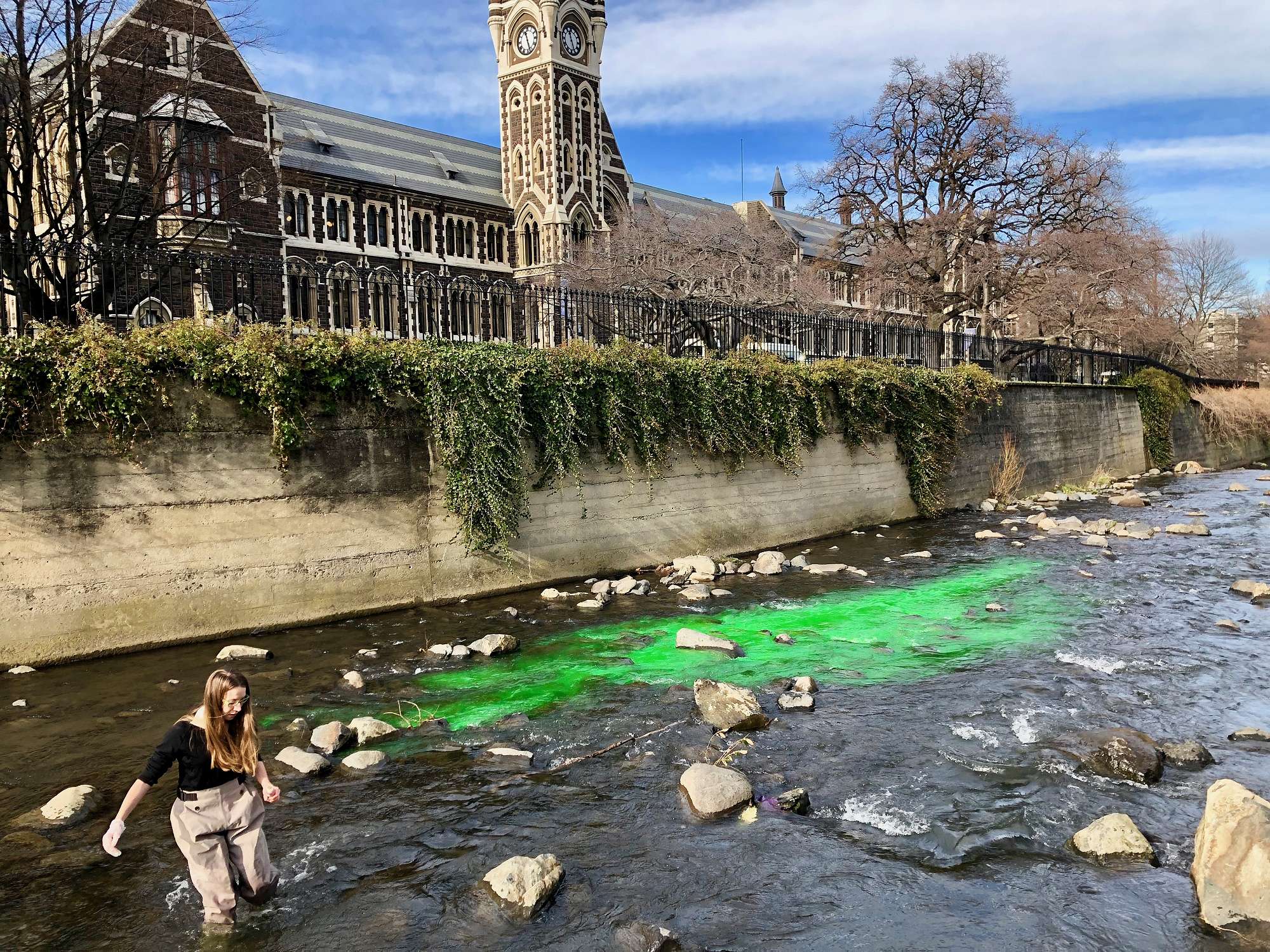 Once we reached the University Quarter we were lucky enough to be joined by Dr Sarah Mager of the University of Otago Hydrology department and were talked through some of the more technical equipment used by them to test much the same things that we were looking at with our meter rules and oranges. Releasing Fluorescein into the river gave the boys an opportunity to see dilution and dispersal patterns within the river and a much clearer visual of the speed of the river when compared to our oranges. (NB thanks to the University for the Fluorescein.)