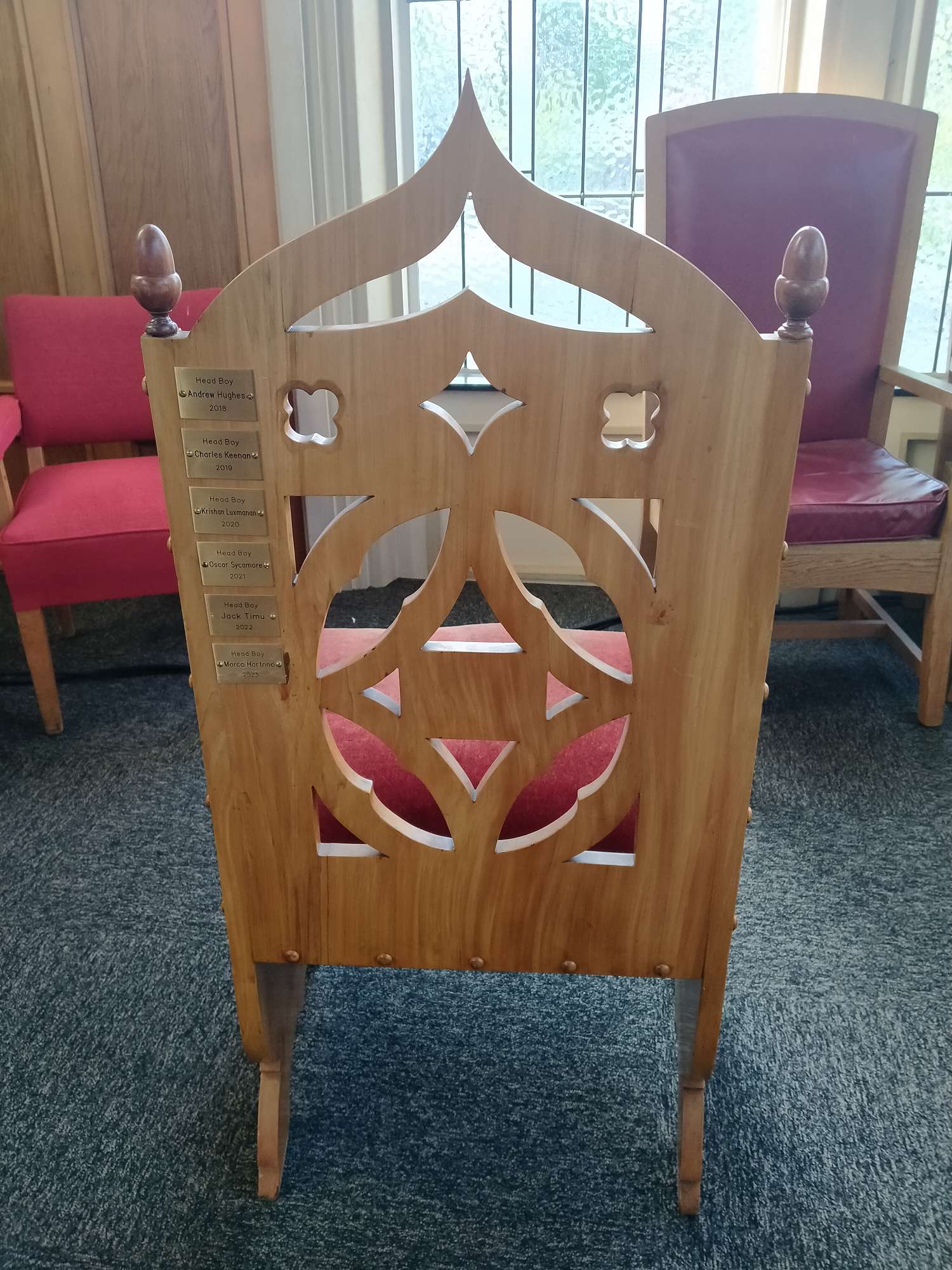 On the chapel stage sits the Head Boy's chair.