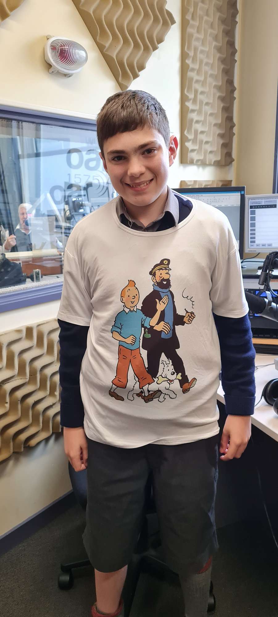 This week Fletcher popped down to the Otago Access Radio studios to record a new intro segment for his show. It was great to have a fresh wee update for this year's show. While he was there, he was also presented with a couple of Tintin t-shirts, from an international fan of his, all the way from Malaysia. Fletcher has a Tintin tribute segment on his show each week and he is clearly having an impact on his national and international audience.