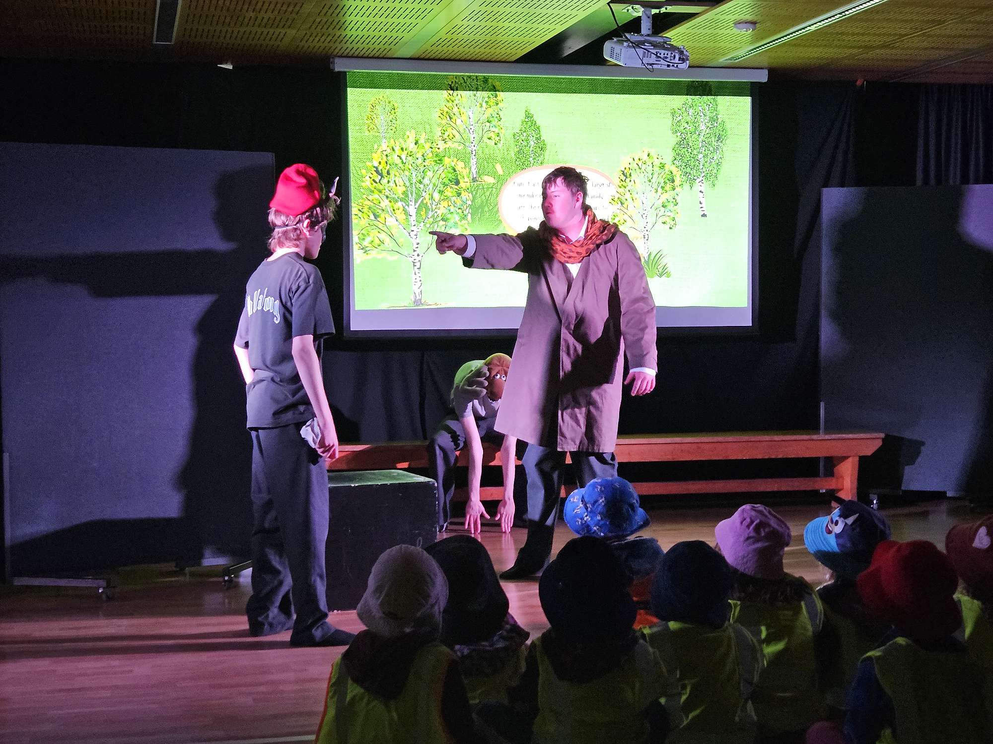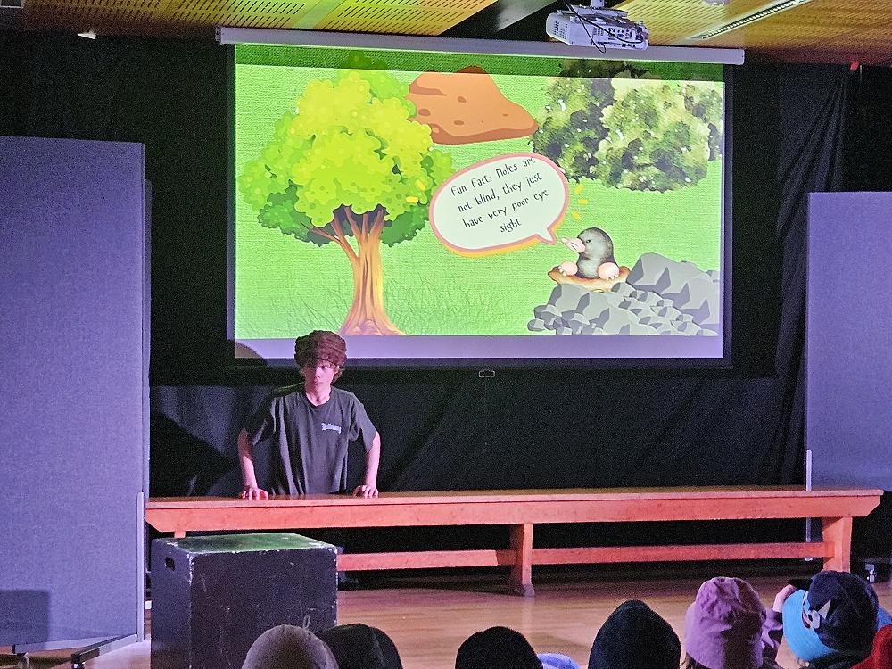 The Year 11 boys handled many aspects of the production themselves: they developed the performance scripts from the picture books, sourced and organised props and costumes, designed the colourful projected slide backgrounds on Canva, and, of course, delivered the entertaining performances.