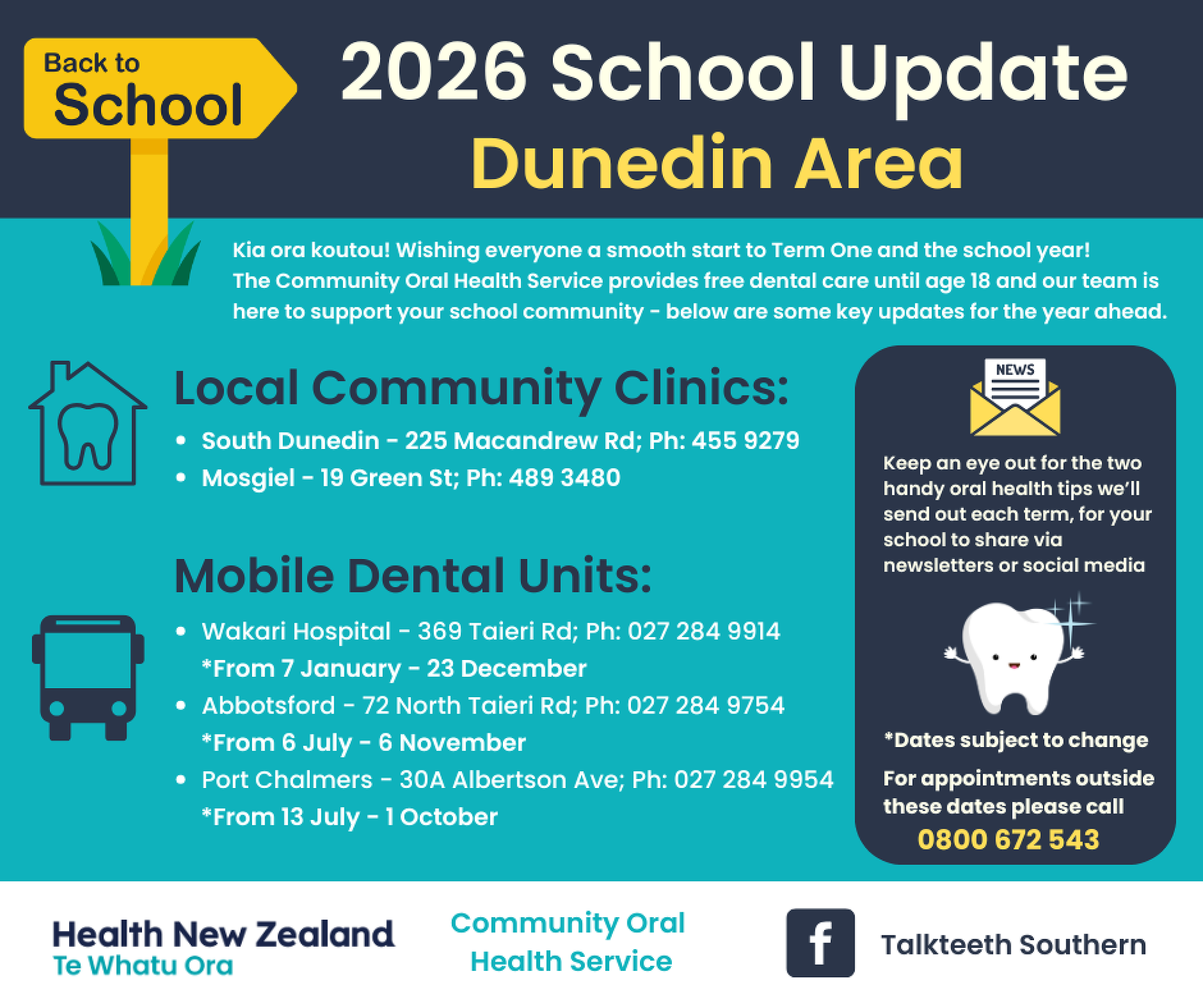 Thursday 19th February 2026 Please see below for the Community Oral Health Service dates and locations for 2026.