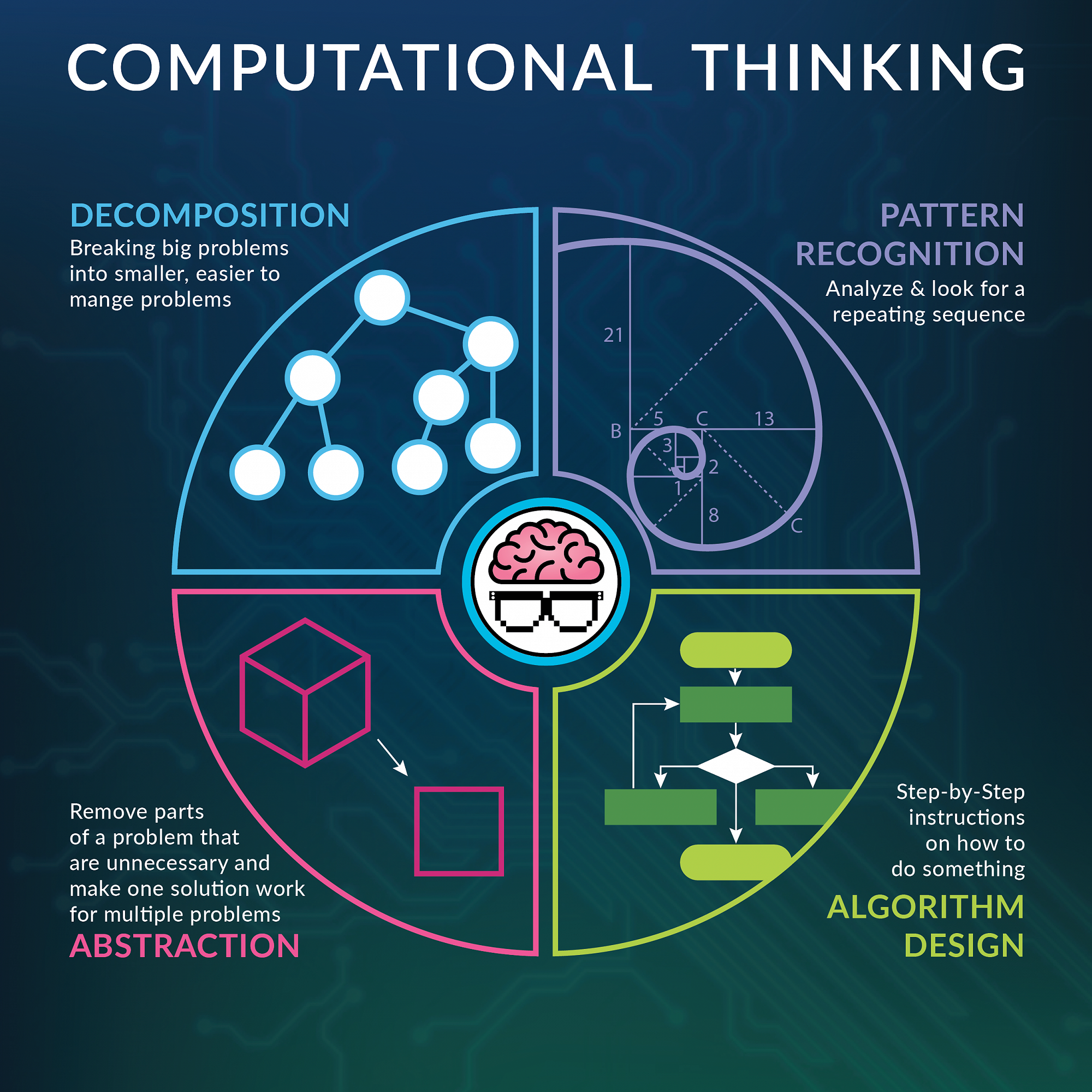 The are 4 main aspects of computational thinking: Decomposition, Abstraction, Pattern Recognition, and Algorithm Design.
